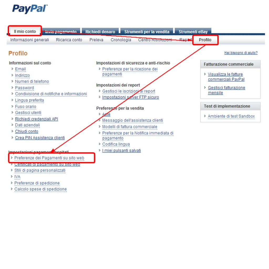 Nel caso di un account PayPal Business, il percorso dei menu sarà analogo a quello mostrato nelle immagini presenti nella gallery.