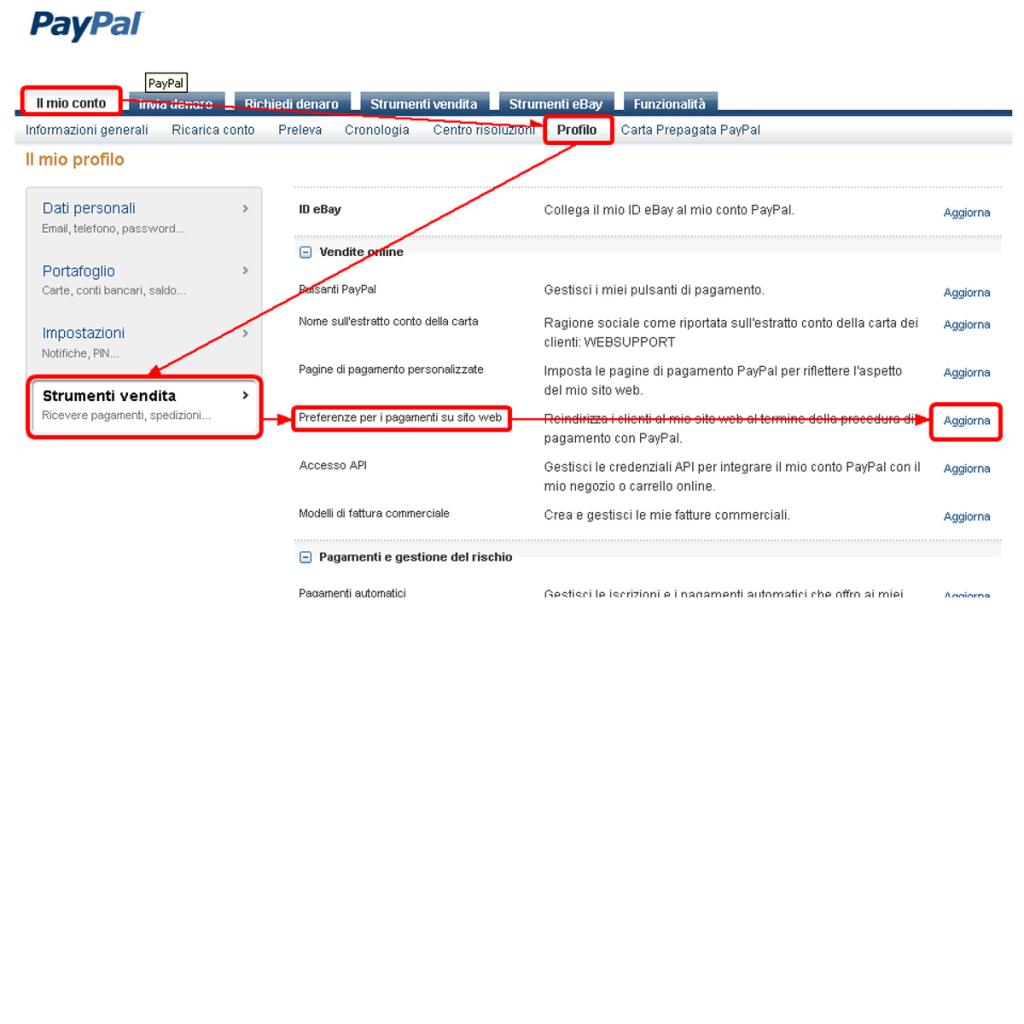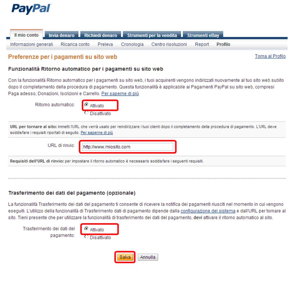 Per garantire la corretta gestione del flusso di acquisto e la ricezione degli esiti delle transazioni, è necessario attivare sul proprio profilo PayPal le funzionalità di Auto Return e PDT.